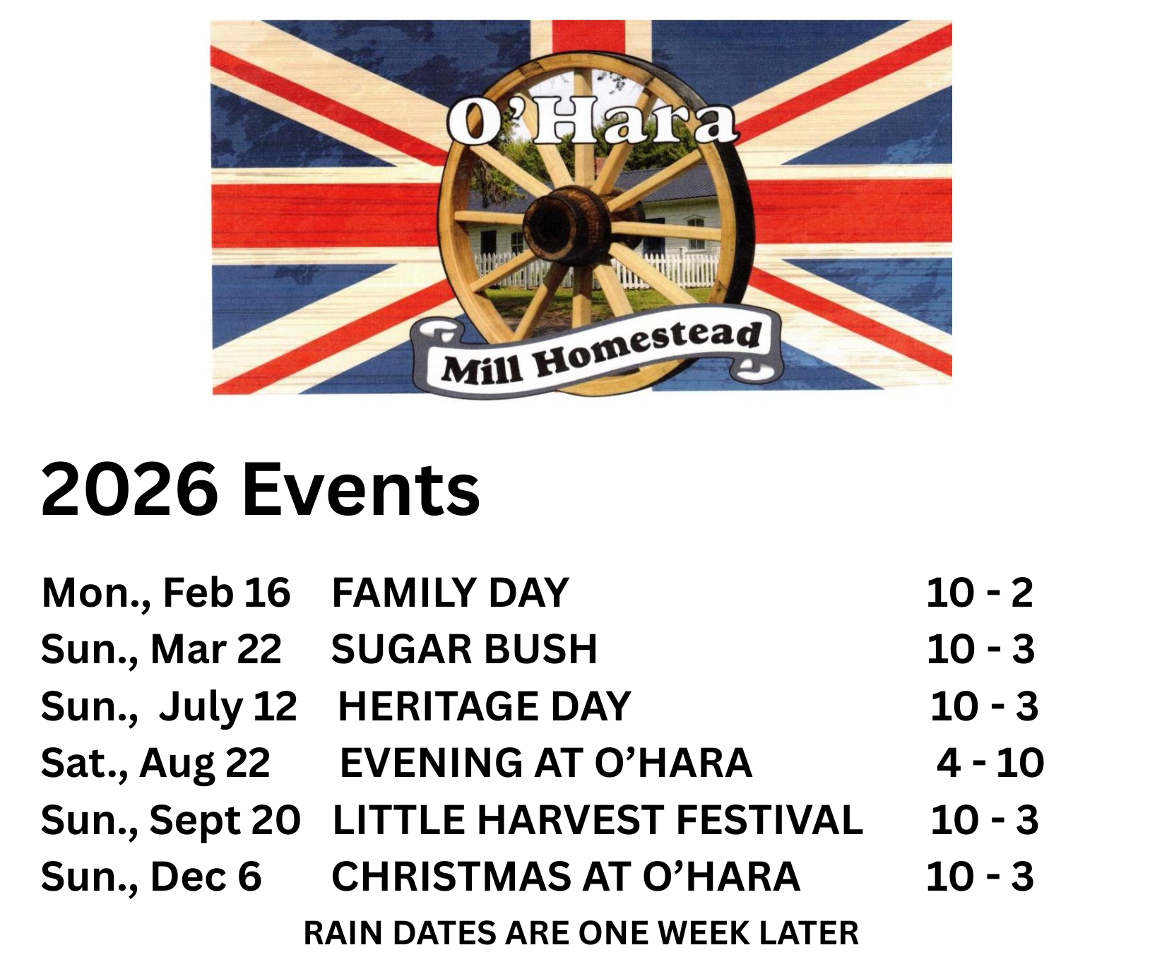 O’Hara Mill Homestead and Conservation Area is a local treasure. It is an opportunity to relive the day to day hardships and rewards of early pioneer life in Ontario.  James O’Hara,Sr., along with wife Mary (Healy) and four-year-old Elizabeth, arrived in Madoc Township in the summer of 1823. Once the family settled, they planted strong, sustainable roots and never moved again. Considered one of the founding families of the Madoc community, the O’Hara buildings, properties and stories were passed through the years from children to grandchildren over a span of four generations.